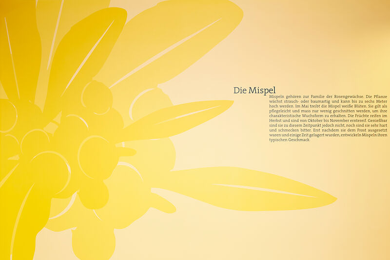 Grundlage für das Signaletik-Konzept war die „Mispel“, die auch im Wappen der Stadt Viersen zu finden ist. Der Baum mit Blüte und Frucht wurde grafisch aufgearbeitet und in jedem Geschoss farblich hervorgehoben. Im Innenhof wurde zudem ein Mispelbaum gepflanzt. So entstand für das Krankenhaus eine eigene Identität, die in der Bevölkerung großen Anklang findet.