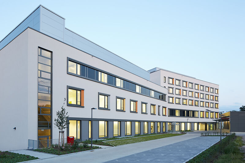 Die Erweiterungsbauten orientieren sich auf die Gartenseite des Geländes. Dadurch entstehen zwei Quader, wovon einer in allen Ebenen durch einen Rundlauf horizontal erschlossen wird und somit kürzeste Wegebeziehungen ermöglicht. Über Lichthöfe werden nahezu alle Räume mit direktem Tageslicht versorgt.